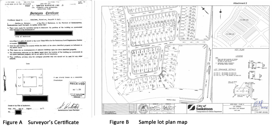 If you cannot find a Surveyors Certificate, you can go to Google Maps, turn on the photo feature, and zoom in on your property to perform an image capture. If you know the dimensions of your lot, say the front width, you can scale the image, and then measure approximate locations of features on your property. You can also go to the City of Saskatoon, Land Branch to get a copy of your residential site plan. This will be to scale and may include dimensions, but it will not show your building on it. A sample lot plan map from the City of Saskatoon is shown below at figure B.
