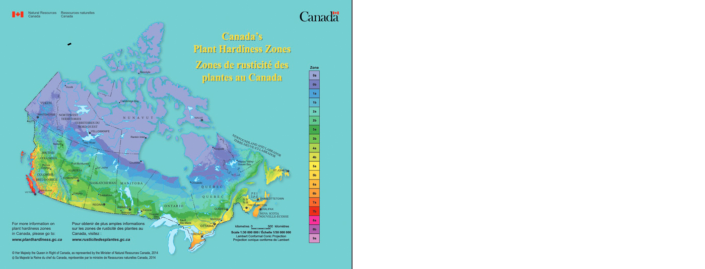 Plants should be selected according to their function in the landscape. However, choices are limited by the plants' hardiness zone classification. North American biomes are divided into 13 hardiness zones based on average seasonal temperatures. They range from the Arctic at Zone 1 to the Tropics at Zone 13. The older neighbourhoods of Saskatoon lie in zone 3b, whereas the outlying new suburbs are zone 2b. A plant with a number 4 or higher will struggle to survive in Saskatoon and will most likely die, particularly during a cold winter. However, there are exceptions, referred to as "microclimates". A warmer microclimate can be created for various reasons, usually relating to sun access and protection from the northwest wind created by a building, fence, or existing landscaping. While this may create a greater risk of mortality, plants with a hardiness classification of up to Zone 5 may survive in a specific location. Commercial greenhouses usually specify the hardiness zone classification of plants they sell, but many other common sources may not. So, buyer beware! Shown below is the Canadian Plant Hardiness Zone Map: